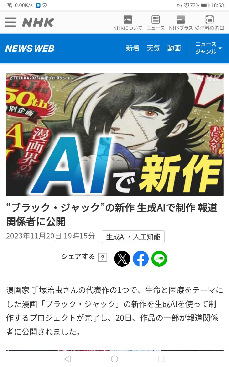 【速報】“ブラック・ジャック”の新作 生成AIで制作削除された記事が1件あります.見る