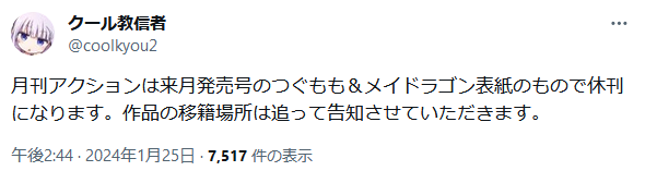 | … | 91無念Nameとしあき24/01/25(木)16:27:41No.1179366596>月刊アクション休刊 |