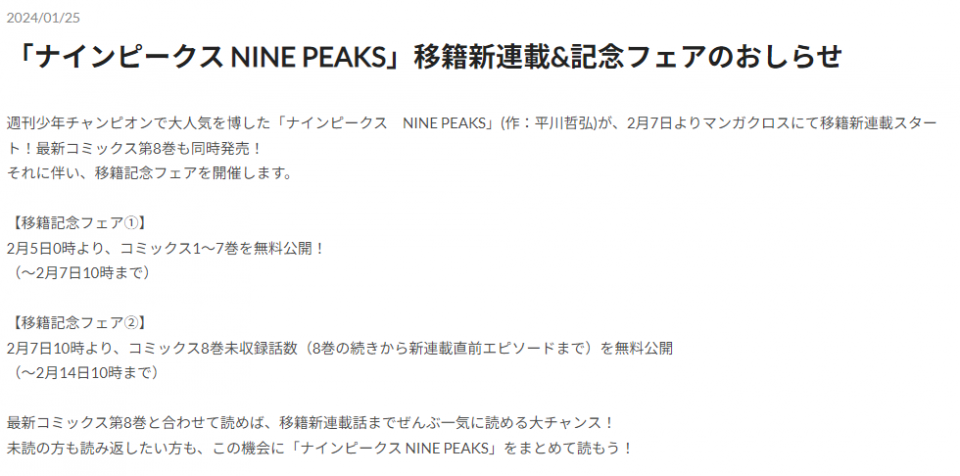 | … | 171無念Nameとしあき24/01/26(金)09:53:46No.1179595469>「ナインピークス NINE PEAKS」移籍新連載&記念フェア |
