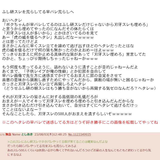 | … | 20無念Nameとしあき24/02/04(日)18:46:41No.1182736713>バキとふし研早バレで調子こいてスレ荒らされるハメになったバカも逮捕されるかな |
