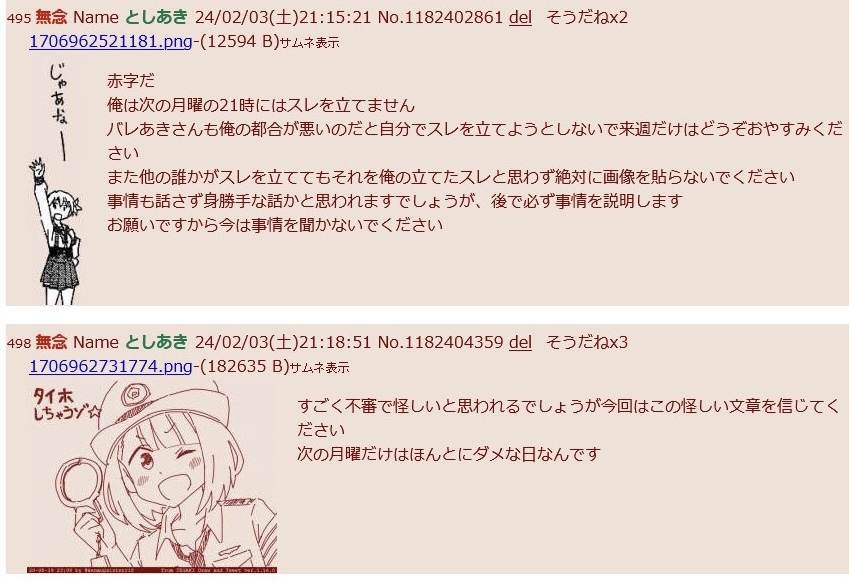 | … | 57無念Nameとしあき24/02/06(火)01:35:34No.1183203532月曜の21時ってどんなスレが立ってたの |