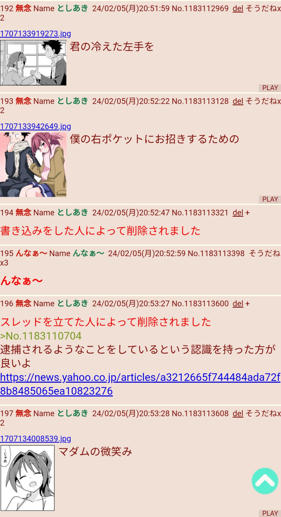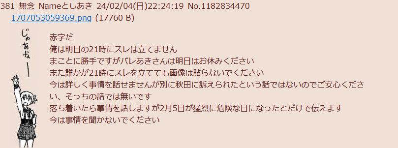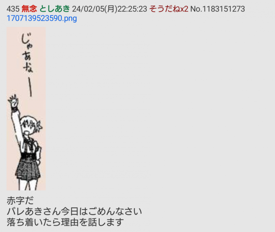 | … | 89無念Nameとしあき24/02/06(火)02:09:00No.1183207847 1707152940408.jpg-(29424 B) >これまでのバレスレのログ全部警察に提出してレスしたやつ全員身元調べなきゃな |