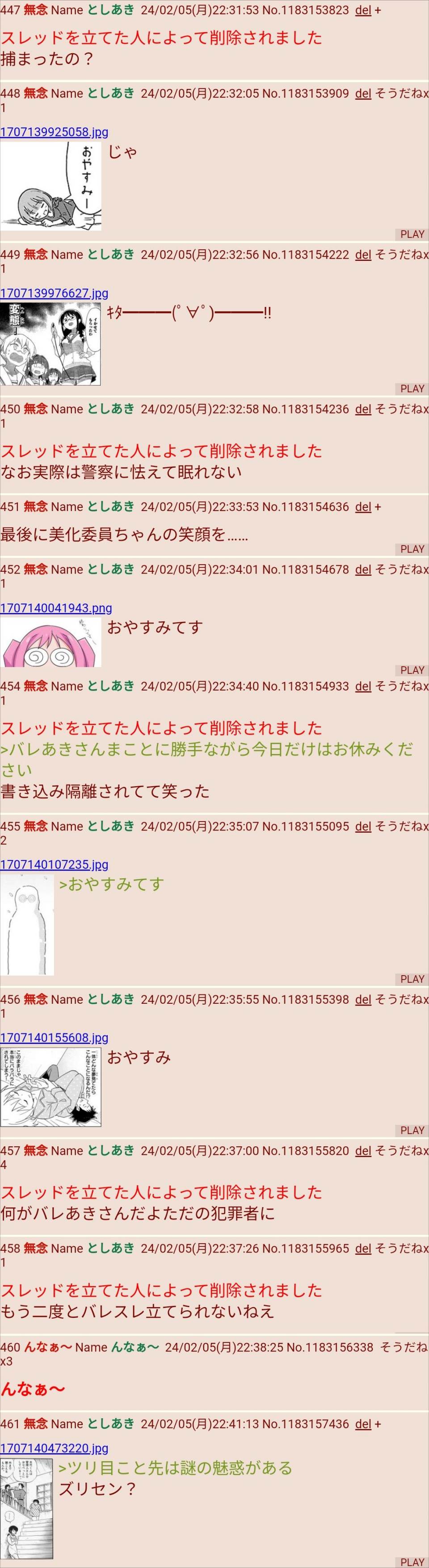 | … | 25無念Nameとしあき24/02/06(火)00:43:33No.1183194282バレスレ監視追跡されて逮捕されるから立てるのやめてくださいってか |