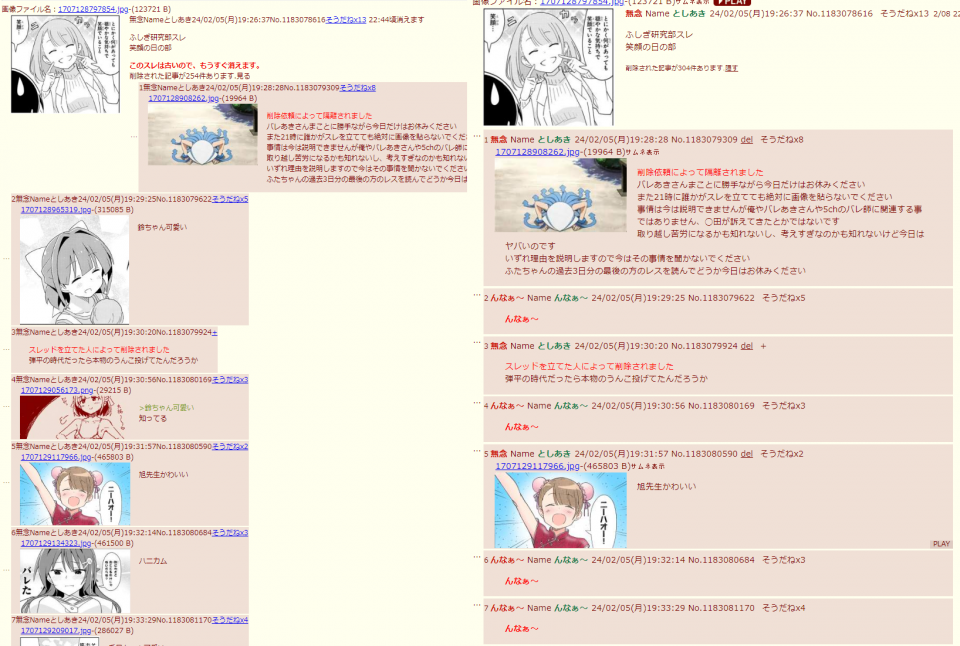 | … | 306無念Nameとしあき24/02/06(火)05:33:01No.1183218791スレ開いたらバレスレで、でも手書きやコラ貼って普段の本スレと同じノリで遊んでたからどういう神経してんのか分からんかったよふし研 |