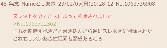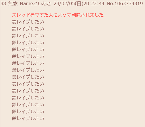 | … | 292無念Nameとしあき24/02/06(火)05:23:20No.1183218350>スレあきにレイプの書き込み消してくれと頼んだら |