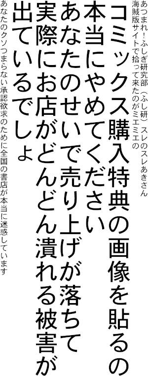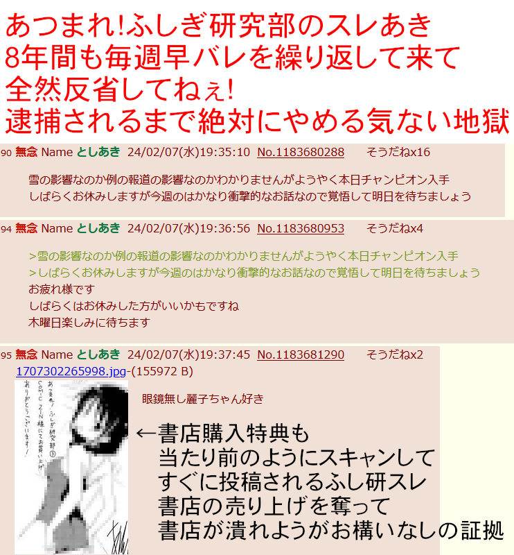 | … | 91無念Nameとしあき24/02/07(水)23:56:37No.1183781996 1707317797374.jpg-(46152 B) ![]() 購入特典を発売日にふし研スレに晒したら書店の売り上げも減少するわな |