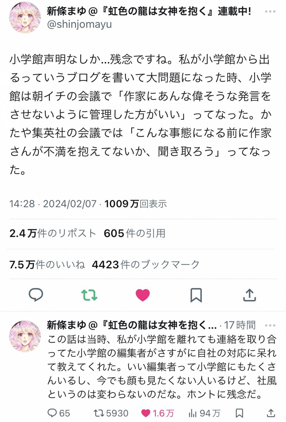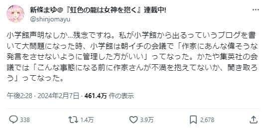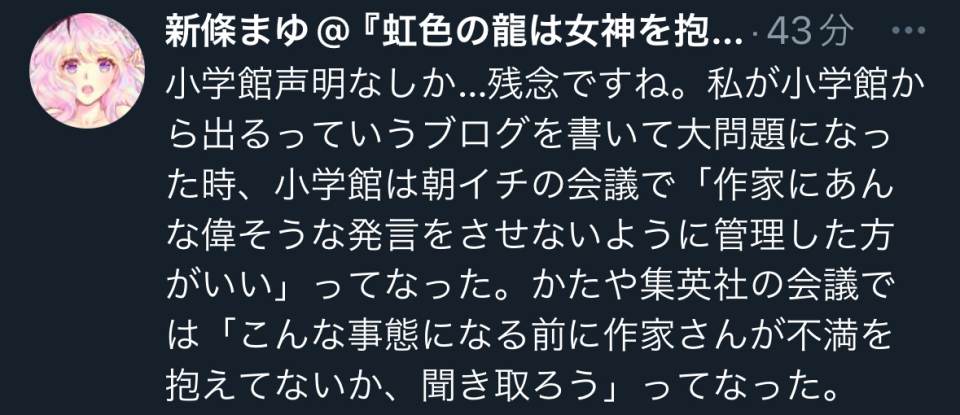 | … | 74無念Nameとしあき24/02/08(木)07:23:41No.1183827396>小学館にとって漫画家は関係者の数に入ってないのかな |