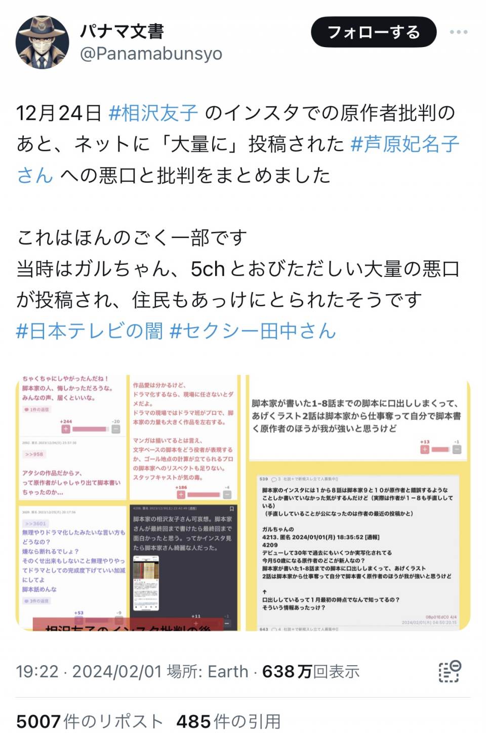 | … | 995無念Nameとしあき24/02/08(木)08:58:23No.1183838791>>何が目的かわからんけど基本的にTV新聞出版はマスコミ業界一体であって本件において社会や個人の味方には究極的にならんかと |