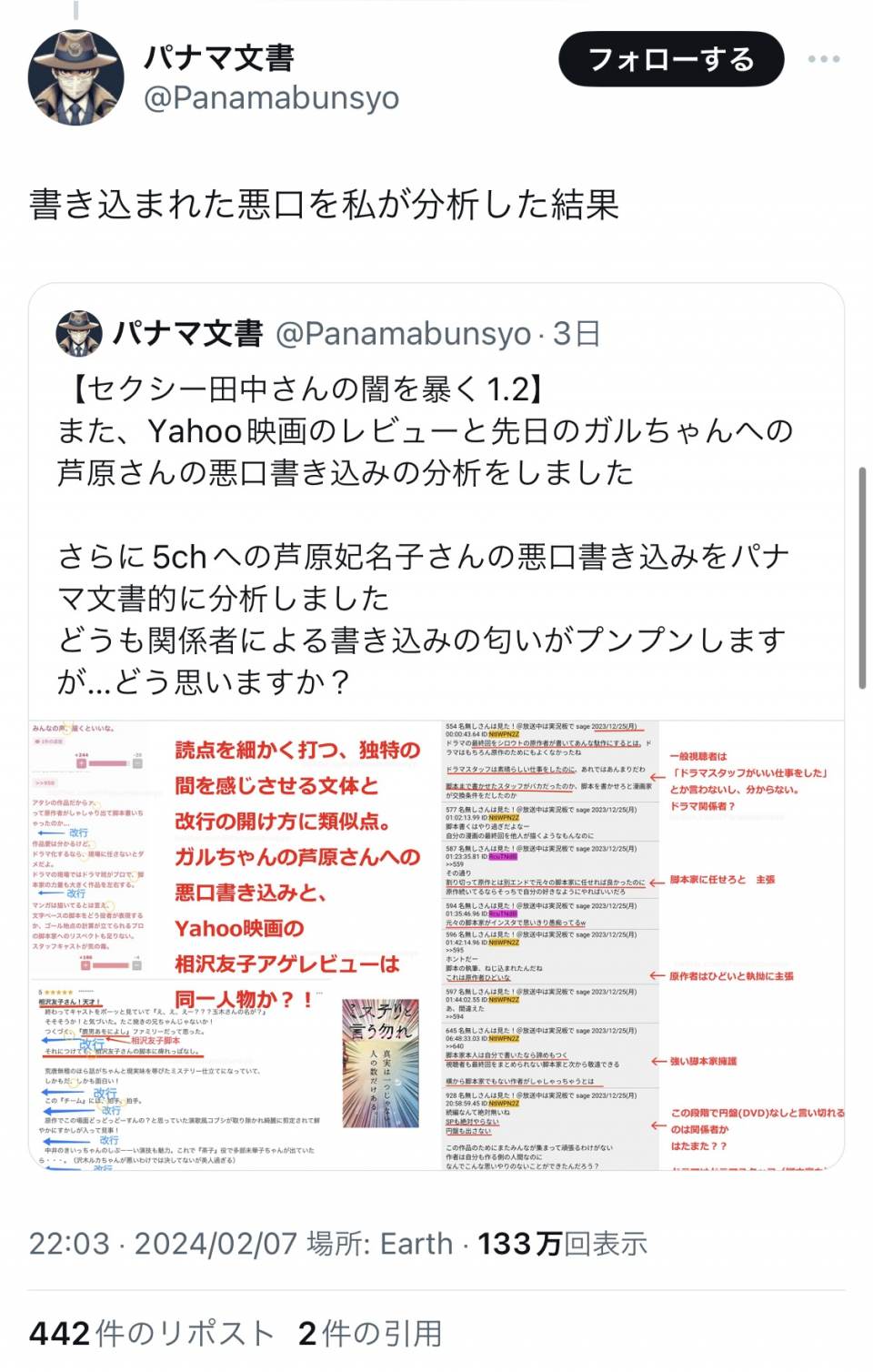 | … | 933無念Nameとしあき24/02/08(木)08:53:11No.1183837885>自殺した原作者への後ろめたい気持ちが無ければ説明するよなぁ… |
