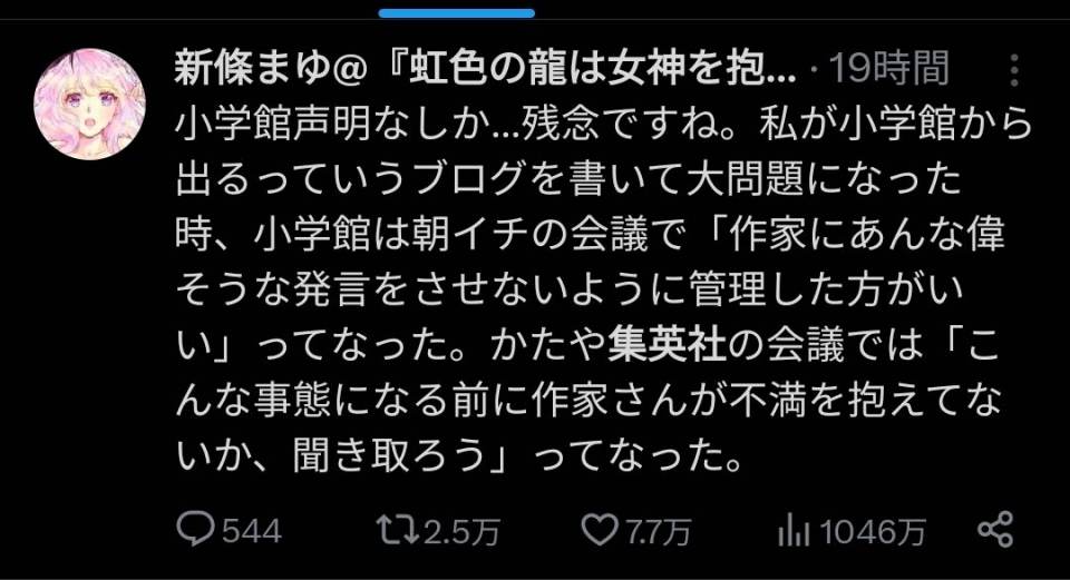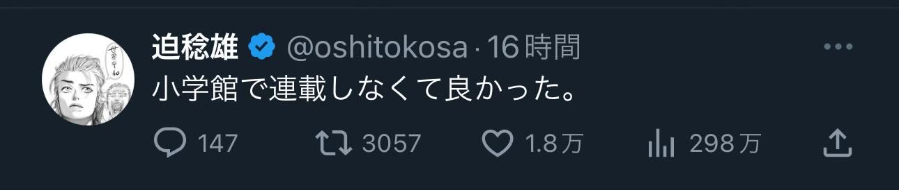 | … | 74無念Nameとしあき24/02/08(木)09:19:44No.1183841416>Xでも所属作家とかが苦言を呈してるしそれを見た人らが小学館どうなってんねんって言いまくっとるやん |