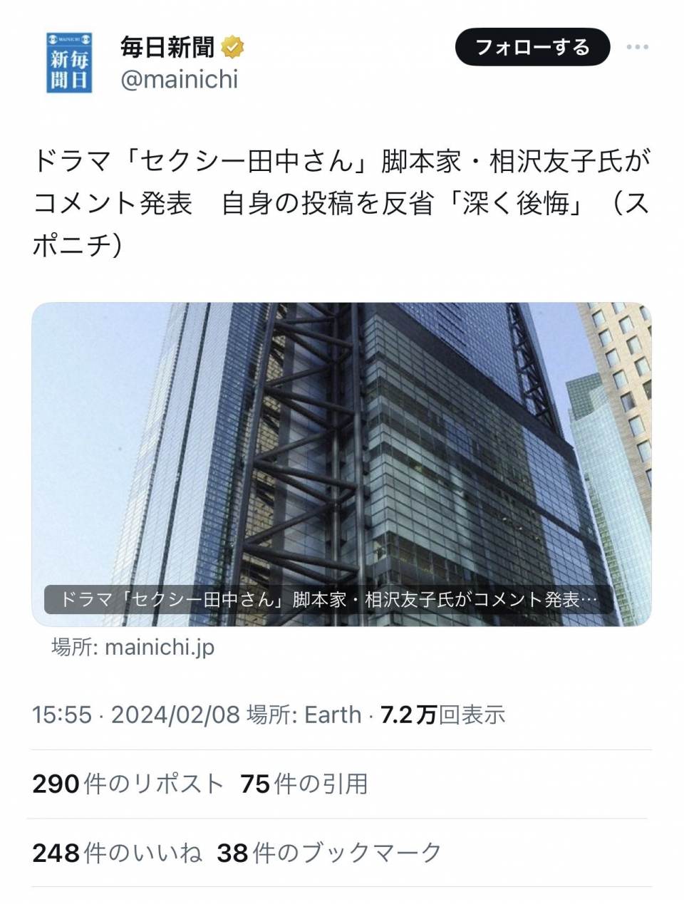 | … | 86無念Nameとしあき24/02/08(木)16:38:14No.1183931266テレビが脚本家のSNSについて触れたのってもしかして今日が初? |