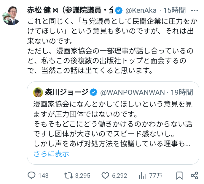 | … | 951無念Nameとしあき24/02/08(木)18:19:52No.1183958266>まあ漫画家の議員なんだから漫画家のためになる働きを期待されてるんだろう |