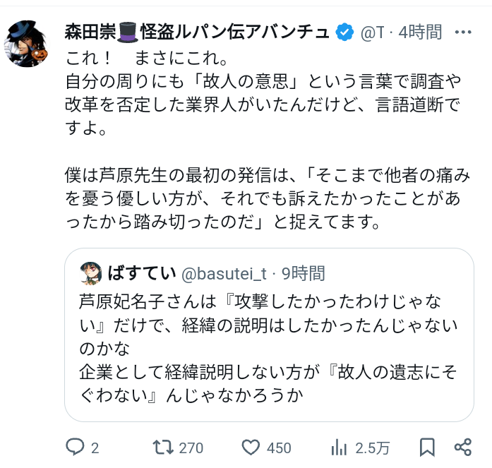 | … | 950無念Nameとしあき24/02/08(木)18:19:44No.1183958221これで芦原さん、脚本家の相沢友子さん、小学館、それぞれの言い分が出揃った。 |