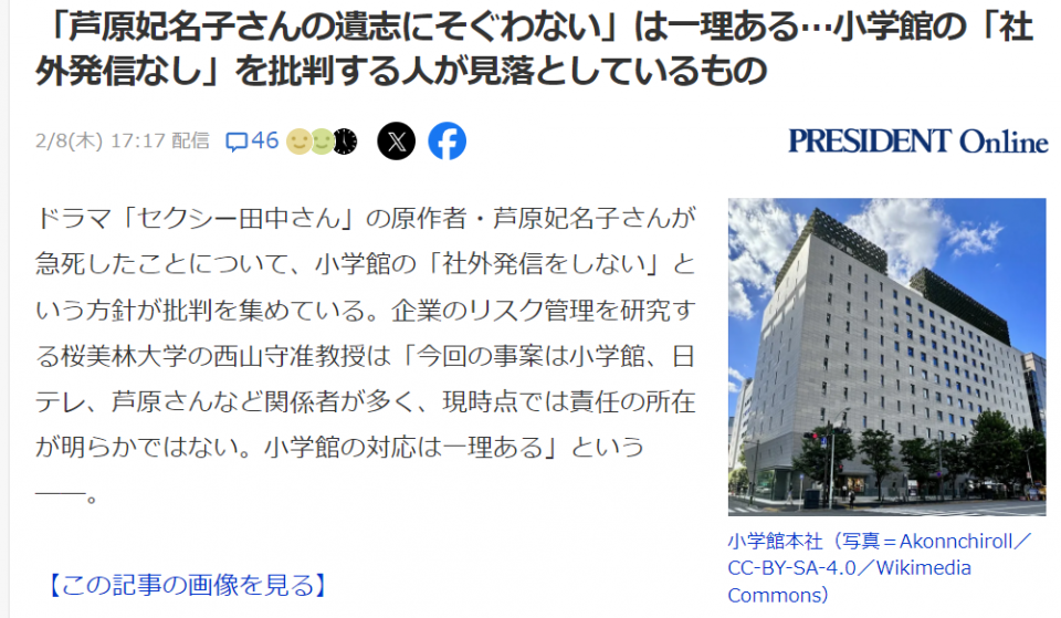 | … | 954無念Nameとしあき24/02/08(木)18:20:07No.1183958357>小学館が新たに声明を発表 |