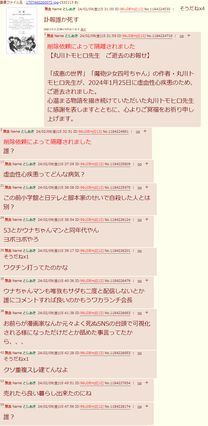 | … | 6無念Nameとしあき24/02/09(金)18:19:54No.1184263724け…訃報… |