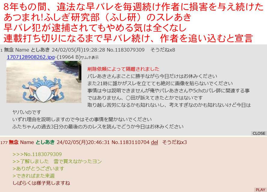 | … | 4無念Nameとしあき24/03/01(金)18:11:03No.1191171249まろんさんが立てたスレ以外はふし研スレとは認めない |