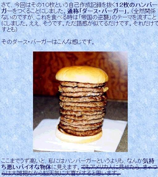| … | 316無念Nameとしあき24/03/07(木)22:14:37No.1193185863 1709817277984.png-(128748 B) ![]() >一度アメリカ式の縦に30センチくらいハンバーグを積み重ねてるハンバーガーを食べてみたいわね |