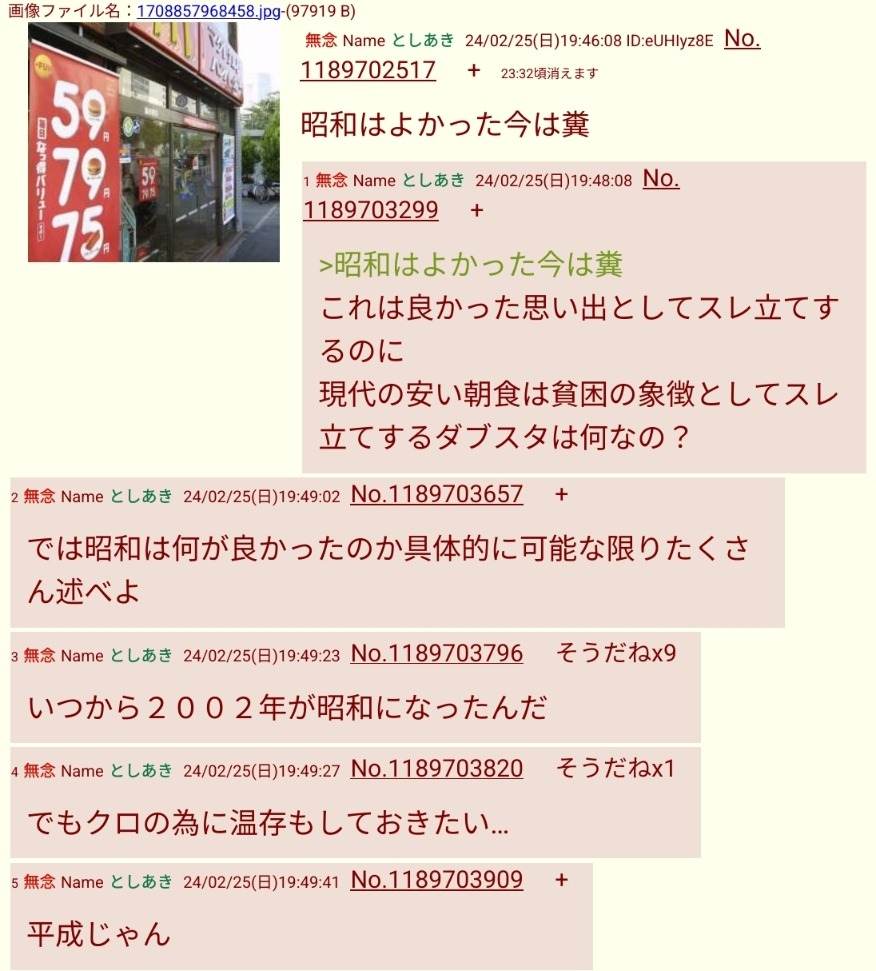 | … | 7無念Nameとしあき24/03/12(火)05:07:53No.1194613848>俺が死んだら昭和に戻していいよ |