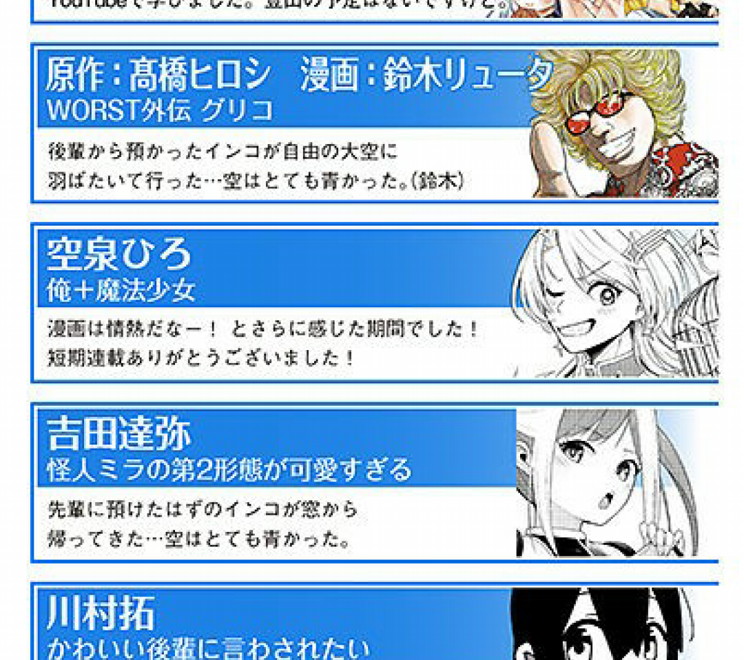 | … | 70無念Nameとしあき24/04/04(木)19:45:21 ID:M0y2weSsNo.1202391844先週の読切の人が来週から短期連載なんだな |