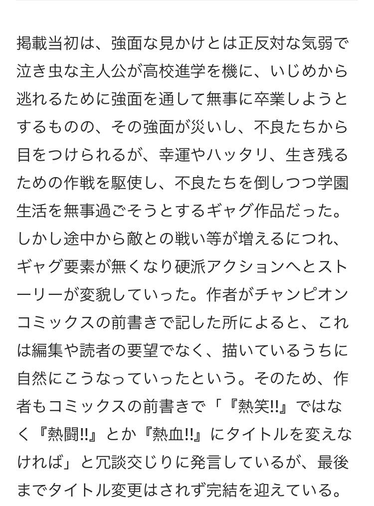 | … | 56無念Nameとしあき24/05/06(月)13:44:14No.1213564062>ギャグからシリアスバトルに移行する不良漫画は多いけどそこからガチの合戦物に移行する漫画はあまりない |