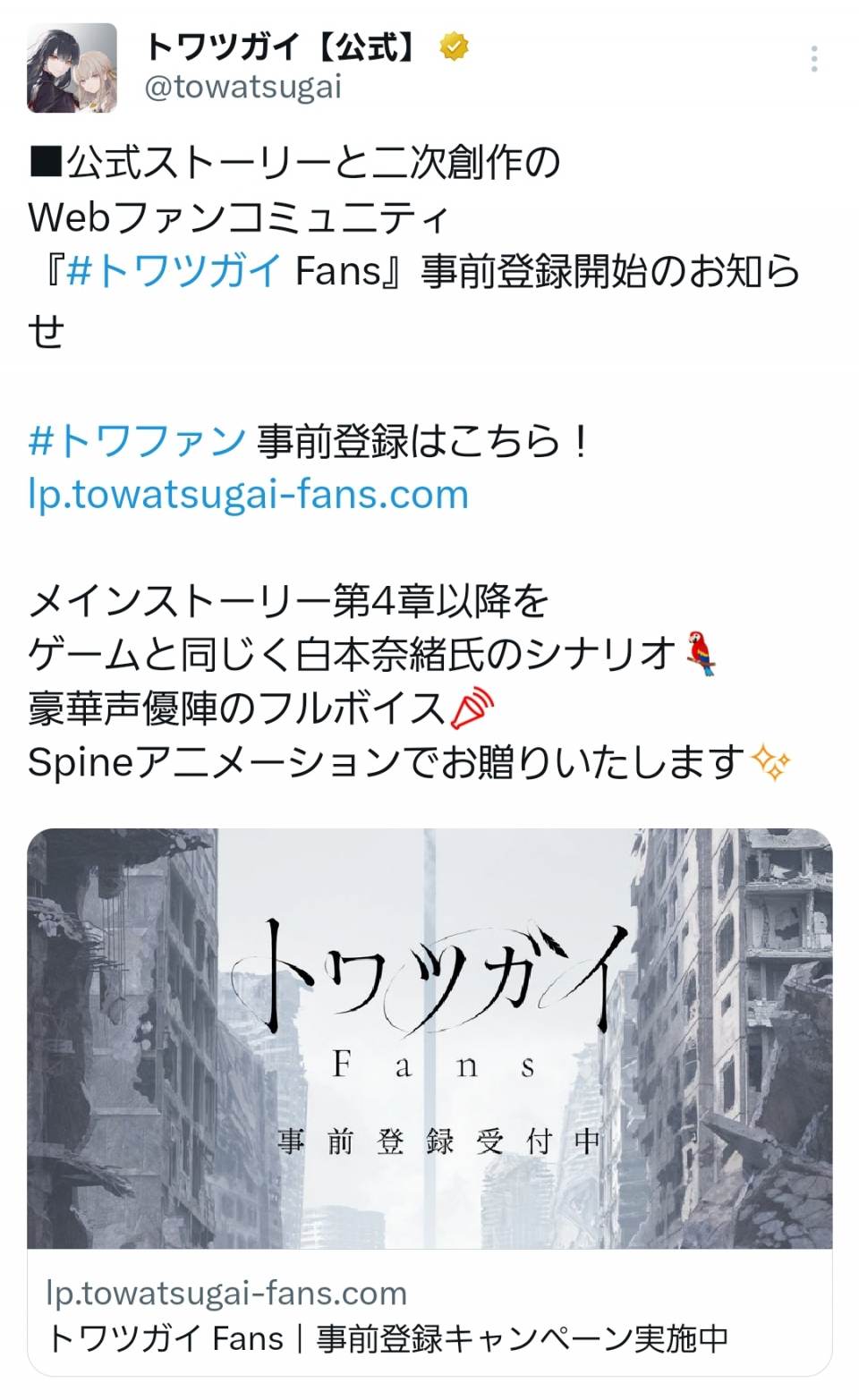 | … | 47無念Nameとしあき24/05/21(火)22:29:56No.1219325531 1716298196109.jpg-(668689 B) ![]() トワツガイはゲームサ終からのメインシナリオや二次創作を楽しむサービスに移行とかなり思いきった展開が待ってる |