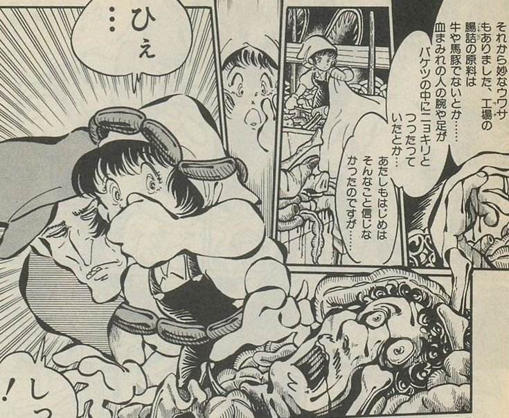 | … | 139無念Nameとしあき24/06/01(土)02:02:23No.1223228560グロとかリョナとかじゃないんだけど腸詰め工場の女の子の漫画を小学生の頃に見て忘れられないと性癖になった |