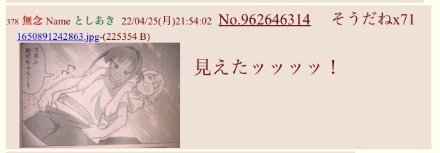 | … | 461無念Nameとしあき24/07/18(木)12:23:57No.1238400104>>としあきはキャラが可愛くて作画が良くてパンツを見せてくれるアニメに弱い… |