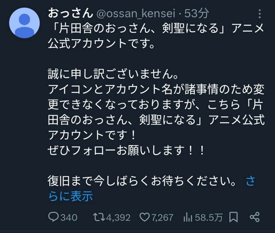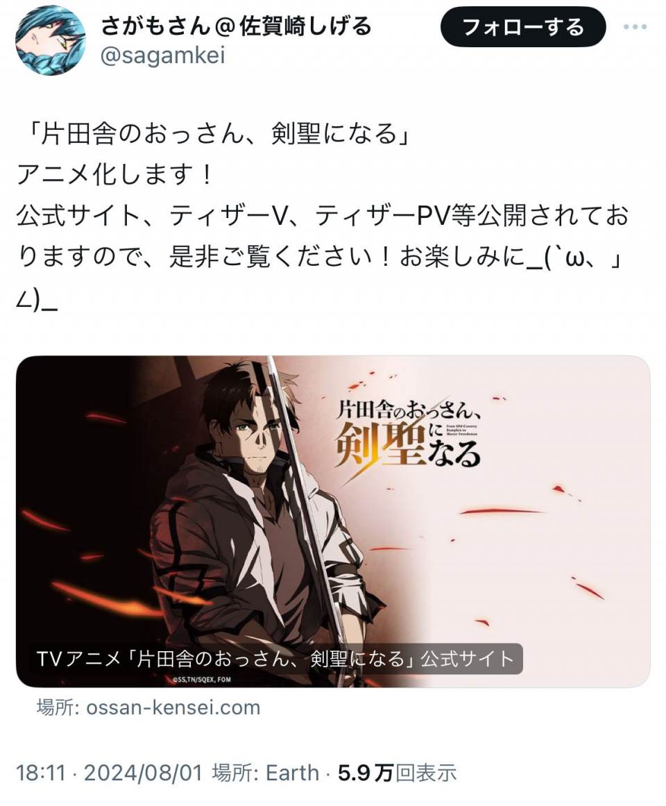 | … | 34無念Nameとしあき24/08/01(木)19:09:05 ID:uQllWKggNo.1242376473>おっさん剣聖アニメ化か |