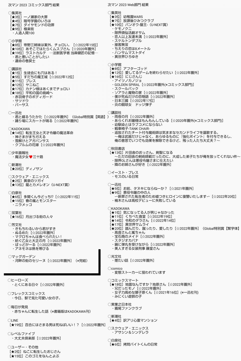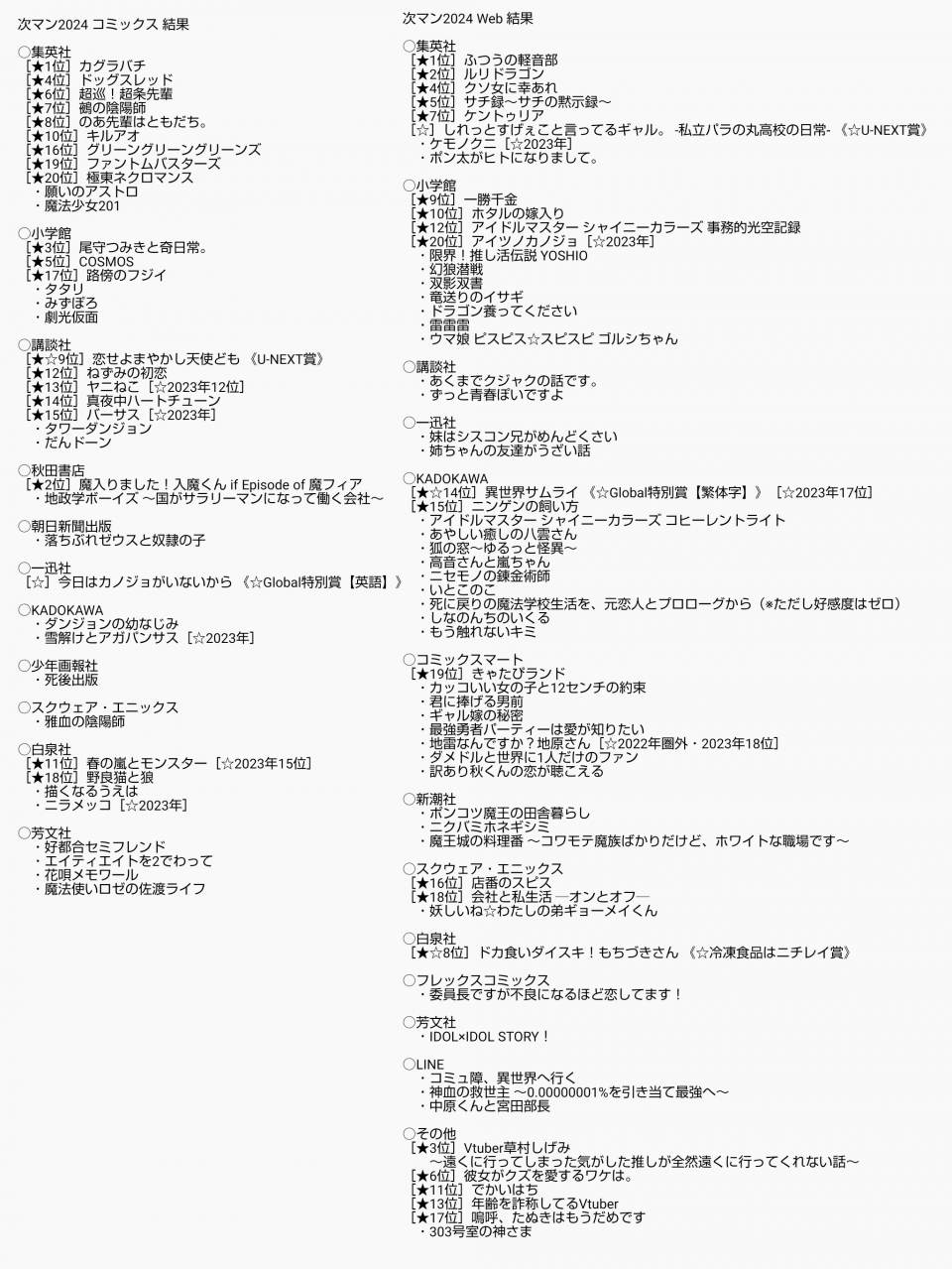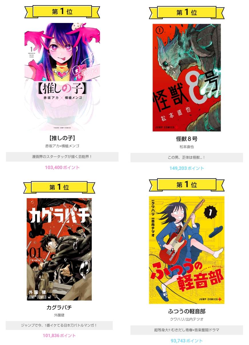| … | 8無念Nameとしあき24/08/30(金)14:34:31No.1250515437>有名どころが集まるせいで集英社ばかりに偏ってる |