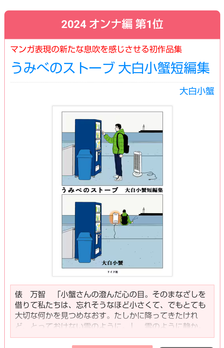 | … | 72無念Nameとしあき24/08/30(金)16:01:25No.1250532147コミックス部門はノミネート作から3作選ぶのが難しいくらい |