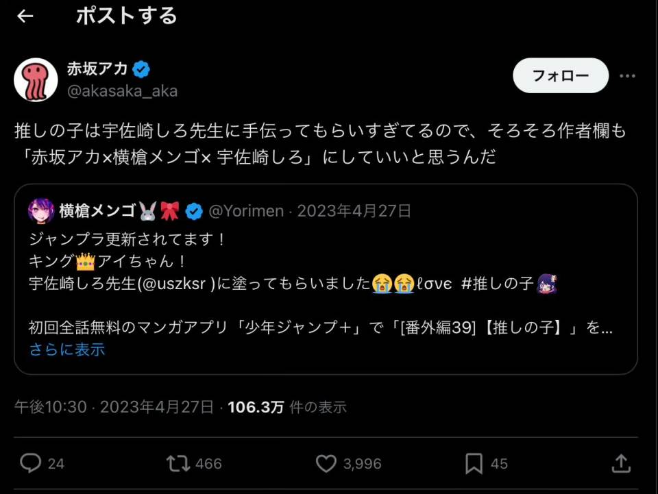 | … | 649無念Nameとしあき24/08/30(金)21:39:25No.1250629474>赤坂アカ先生もそのうちジャンプきそう |