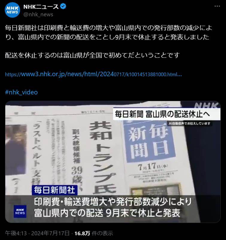 | … | 56無念Nameとしあき24/09/08(日)18:49:46No.1253093844>>新聞は大丈夫なの? |