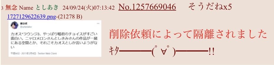 | … | 55無念Nameとしあき24/09/24(火)09:11:29No.1257681281そのレスが荒らし |