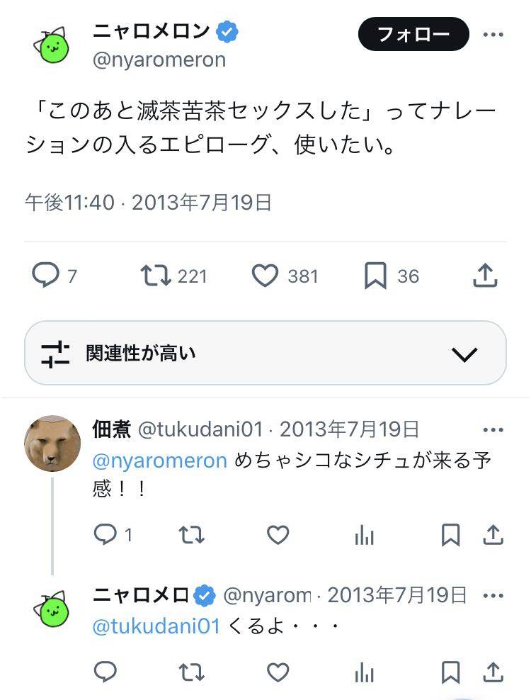 | … | 96無念Nameとしあき24/09/24(火)10:58:22No.1257697038>このあとめちゃくちゃセックスしたの元祖がニャロメロンだと知ってめちゃくちゃ驚いた |