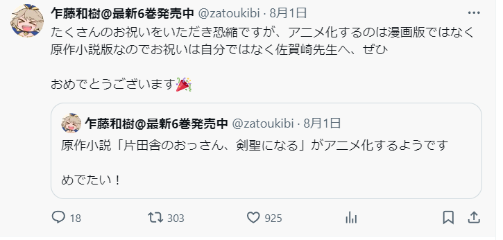 | … | 358無念Nameとしあき24/09/30(月)02:16:25No.1259437566>「アニメ化おめでとうございます!」ってポストをクソほど貰ったから |