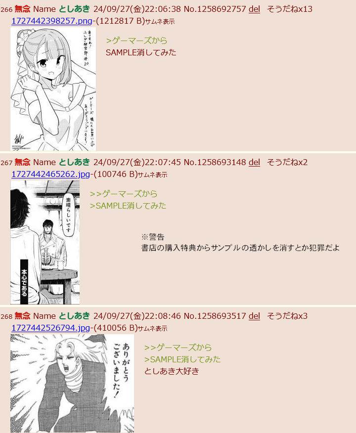 | … | 12無念Nameとしあき24/10/05(土)21:00:44No.1260971834>書店の購入特典画像から「サンプル」の透かしを消してアップしている犯罪者まろん。書店の売り上げに損害を与えてそんなに楽しいか? |