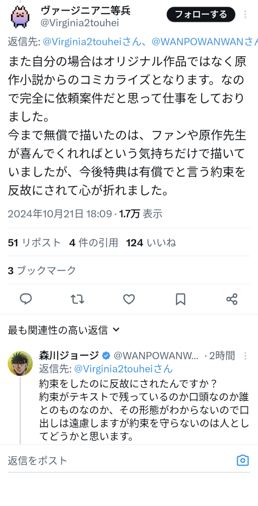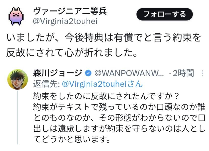 | … | 49無念Nameとしあき24/10/22(火)08:56:26No.1265593251>のぶの人は原稿料だすって話を反故にされたから怒ってるんじゃなかったか |