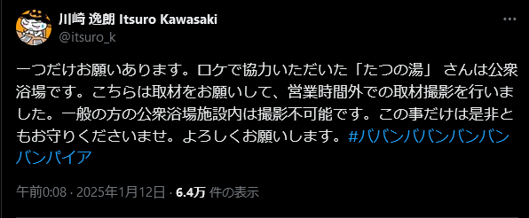 | … | 329無念Nameとしあき25/01/18(土)23:59:52No.1289237080うちの近所の銭湯に似てるなーと思って見てたがスタッフロールに協力って書いてあってマジで近所の銭湯がモデルだったわ |