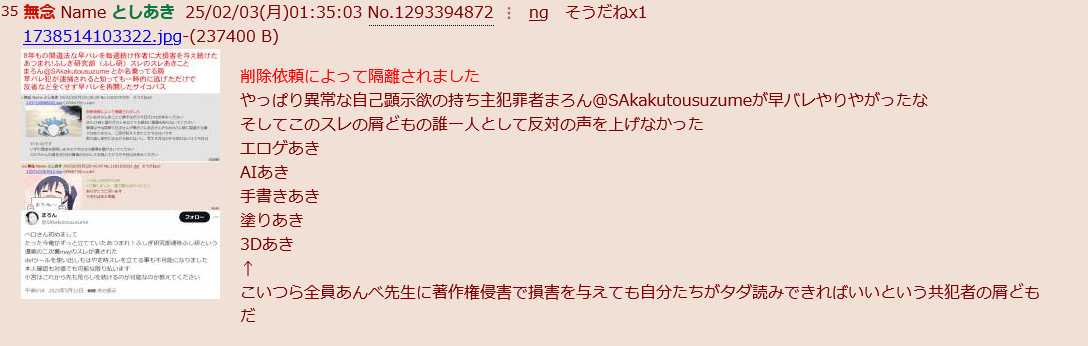 | … | 211無念Nameとしあき25/02/03(月)19:42:38No.1293535692>その荒らしは以前から違法スクリプトを使ってなんどもふし研スレの削除権停止させてるんですわ |