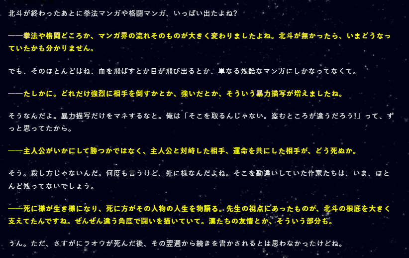 | … | 502無念Nameとしあき25/07/20(日)15:20:03No.1336934865>「北斗の拳みたいにしようよ」は恐らくあの時代の劇画バトル系作家みんな言われたことだろうから… |