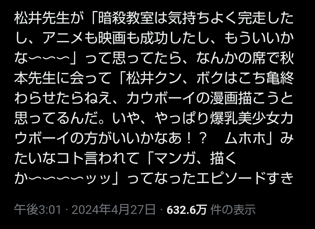 | … | 80無念Nameとしあき25/07/27(日)08:55:10No.1338607412こち亀やワンピースみたいに自分のやりたいジャンルを継続してるヒット作に盛り込むのがベストかな |