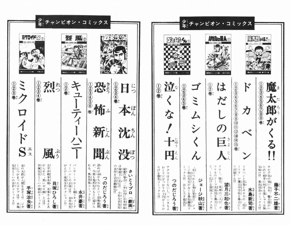 | … | 52無念Nameとしあき25/08/03(日)12:20:53No.1340382112 1754191253601.jpg-(946498 B) ![]() >チャンピオンコミックスの巻末にあったコミックスの紹介は中々面白かったな |