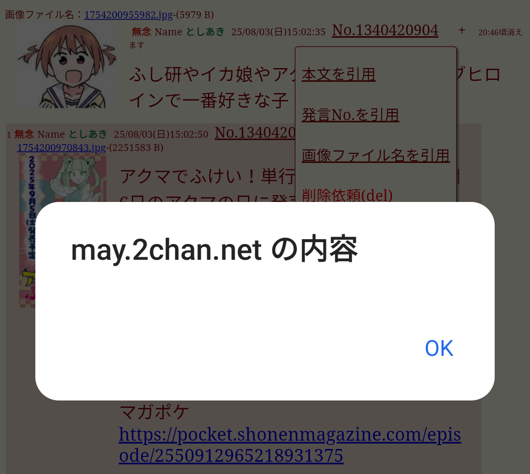 | … | 379無念Nameとしあき25/08/03(日)22:36:17No.1340556691>「侵略!イカ娘」とか「あつまれ!ふしぎ研究部」とか「アクマでふけい!」とかの作品を語るスレ |