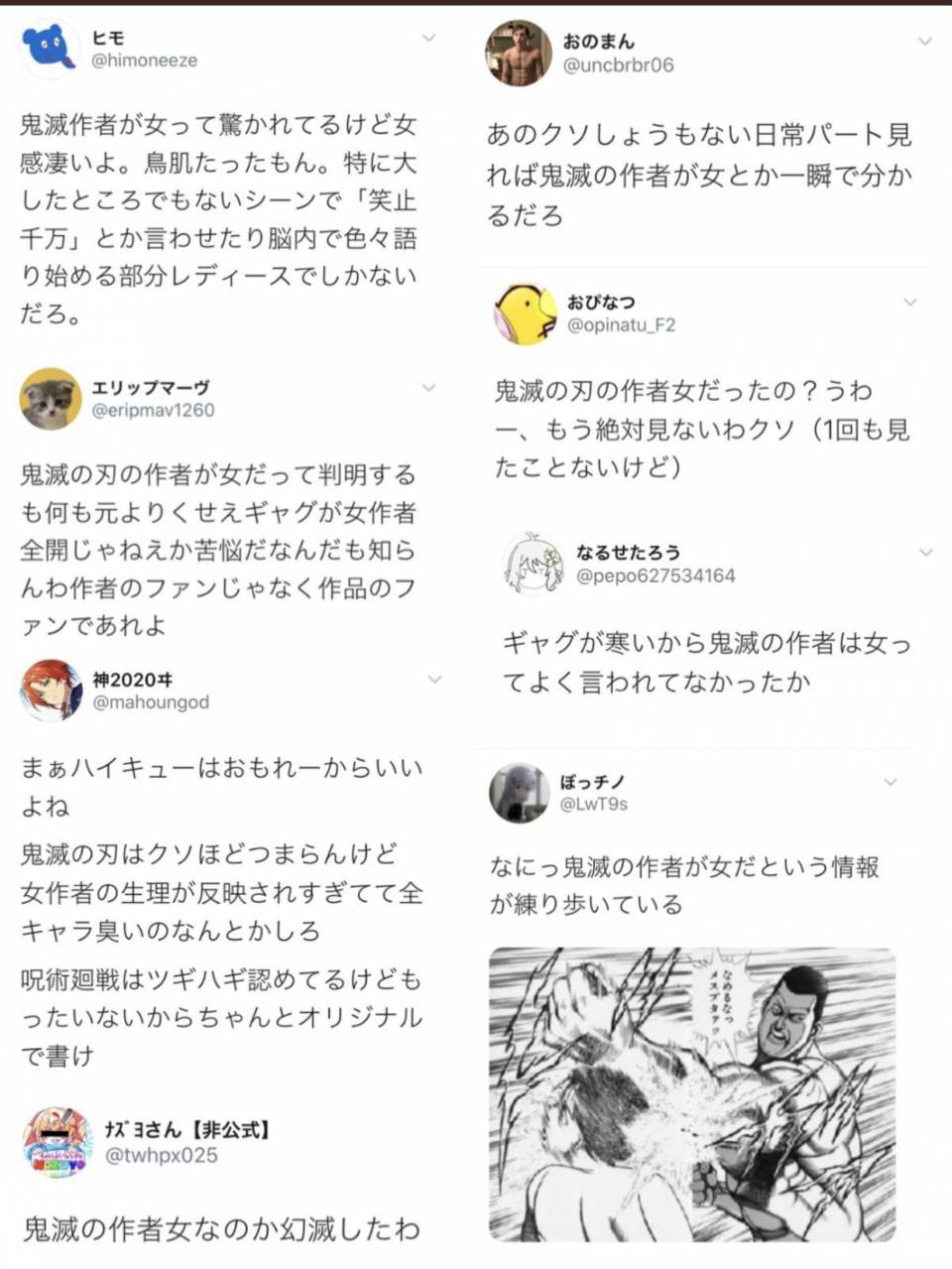 | … | 454無念Nameとしあき25/08/16(土)19:52:13No.1343915397>そもそも鬼滅ってただ作者が女性なだけであって女狙い要素あるか? |
