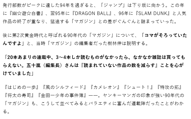 | … | 192無念Nameとしあき25/10/22(水)13:13:24No.1360555642>マガジンはジャンプを目指してバトル漫画ばかりになって自分たちの強みを消して自爆した印象があるな |