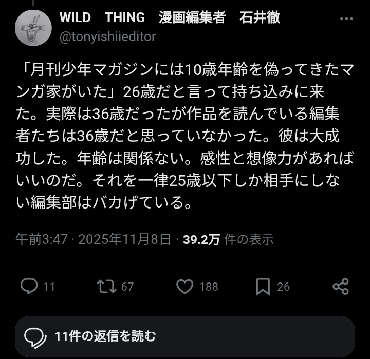 | … | 61無念Nameとしあき25/11/11(火)09:22:07No.1365317017>ツリーを全部読むと本人の趣旨としては社会人経験のない10代ですぐ売れる漫画描くのは難しいから |