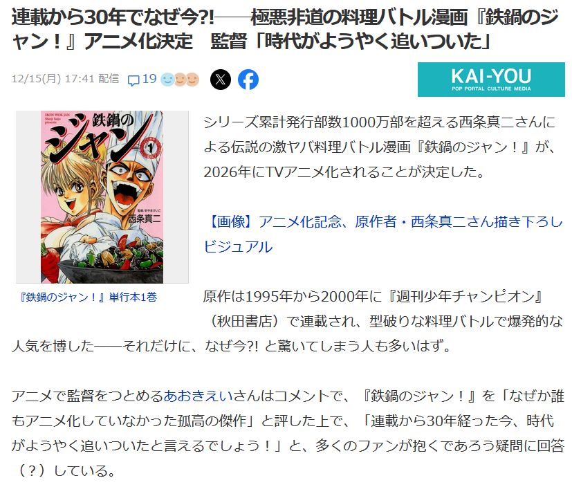 | … | 983無念Nameとしあき25/12/15(月)20:47:04No.1373314497>ジャンが好きでアニメ化したい!って人が偉くなってるのは |