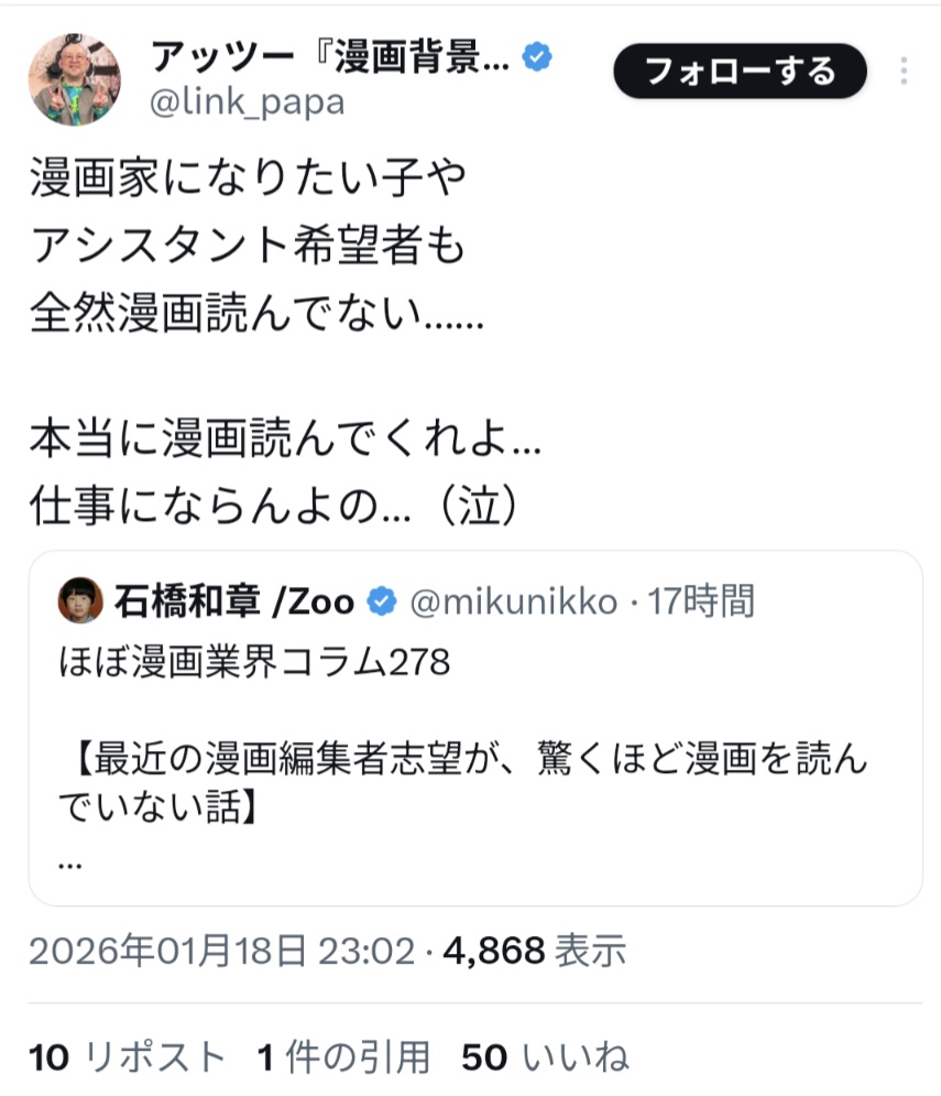 | … | 32無念Nameとしあき26/01/20(火)09:25:55No.1381438139 1768868755777.jpg-(116274 B) ![]() >漫画を全然読まないけど漫画家になりたい人が増えているようだ |