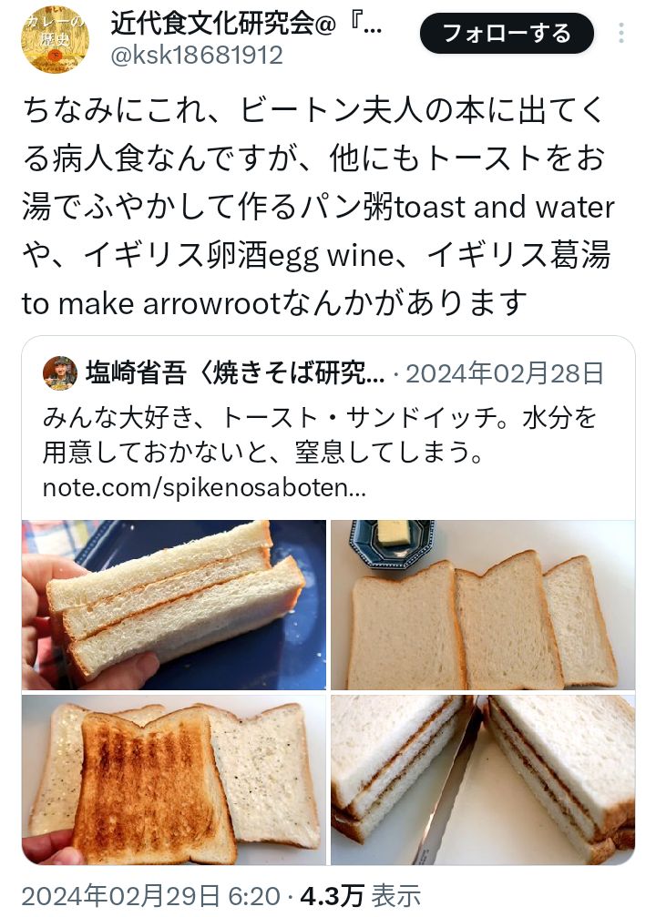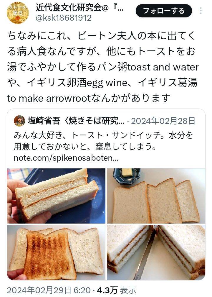 | … | 34無念Nameとしあき26/01/27(火)00:30:28No.1382961893 1769441428599.jpg-(77387 B) ![]() なんとなくフレンチトースト的なの連想するけど全然違うんだろうな |