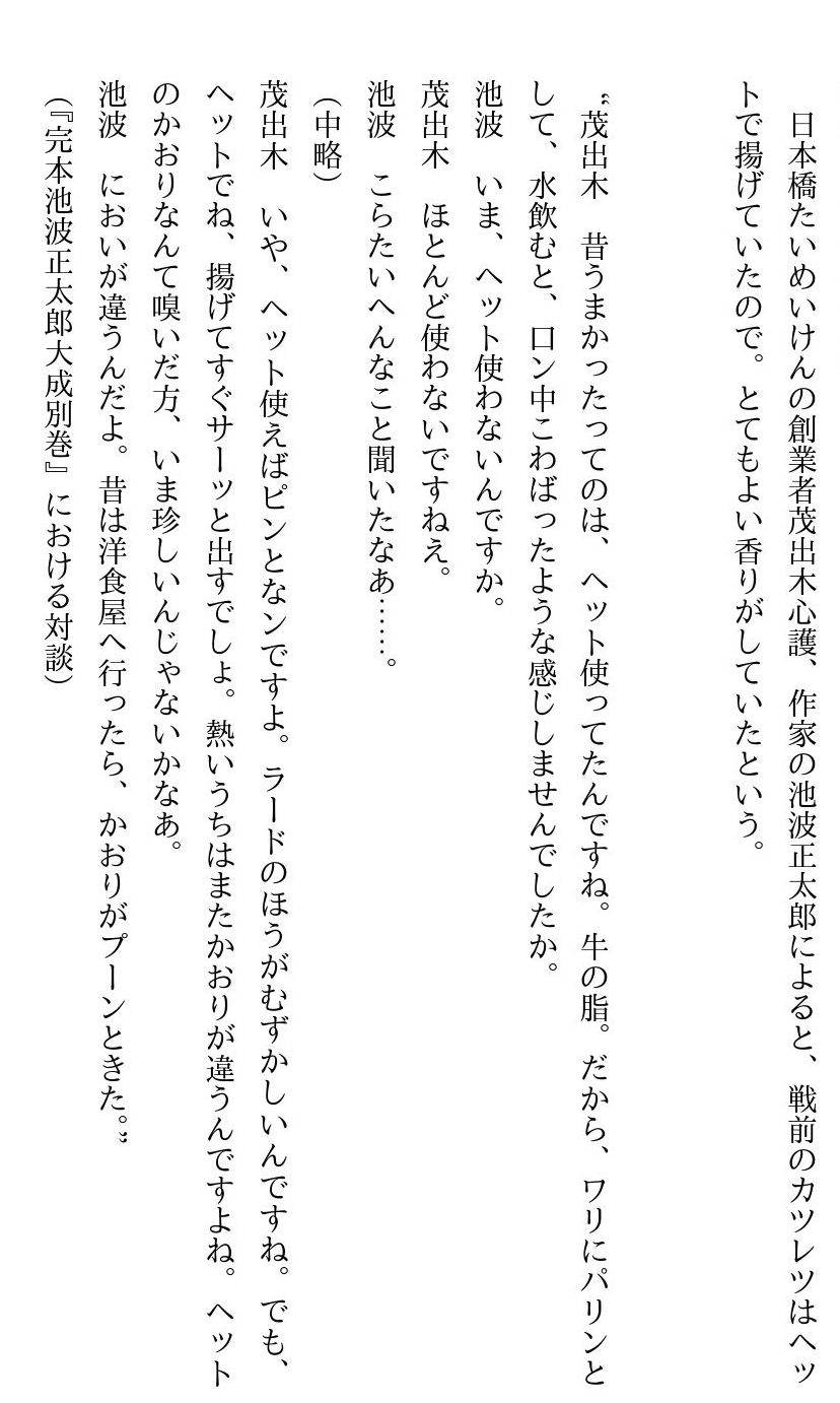 | … | 244無念Nameとしあき26/01/27(火)13:18:38No.1383029311 1769487518892.jpg-(139656 B) ![]() 池波正太郎とカツといえばとんかつをラードで揚げるのは新しいスタイルだそうな |